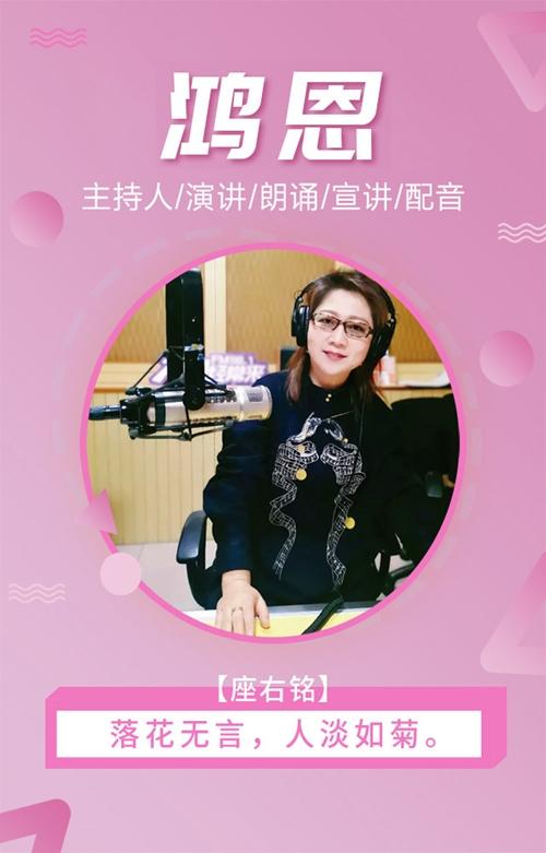 鴻恩,長(zhǎng)期專注于主持、演講、朗誦、宣講、配音等工作,相關(guān)業(yè)務(wù),敬請(qǐng)咨詢。