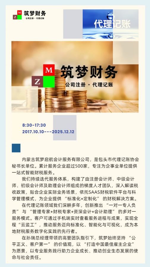 | 名稱 | 內(nèi)蒙古筑夢啟航會(huì)計(jì)服務(wù)有限公司 |